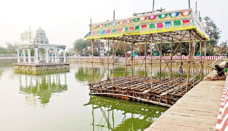 அங்கு தங்க முலாம் பூசப்பட்ட கொடிக்கம்பத்தில் தெப்ப திருவிழாவிற்கான கொடியேற்றம் மேளதாளங்கள் முழங்க நடைபெற்றது.
